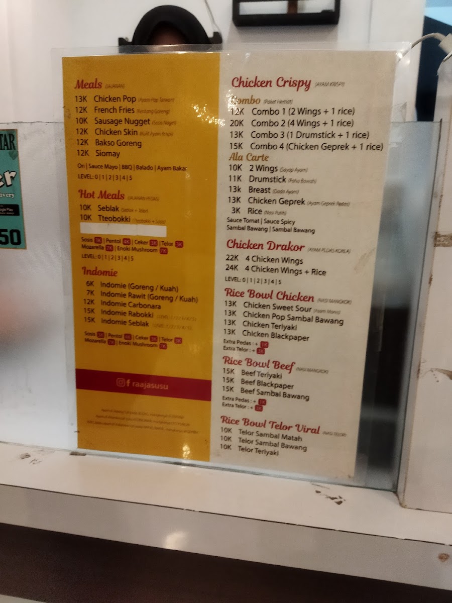 The cafe strikes a balance between quality and value, making it a favorite among regulars like Qurratul Aini and Ismi A, who appreciate the hearty portions and friendly service. Despite some drinks being slightly pricier for the area, the refreshing options are worth it. Whether you're visiting to indulge in Tape Mayang or simply enjoy conversations over a glass of es jeruk, RAAJA SUSU CAFE & EATERY promises a memorable dining experience enriched with local flavor.